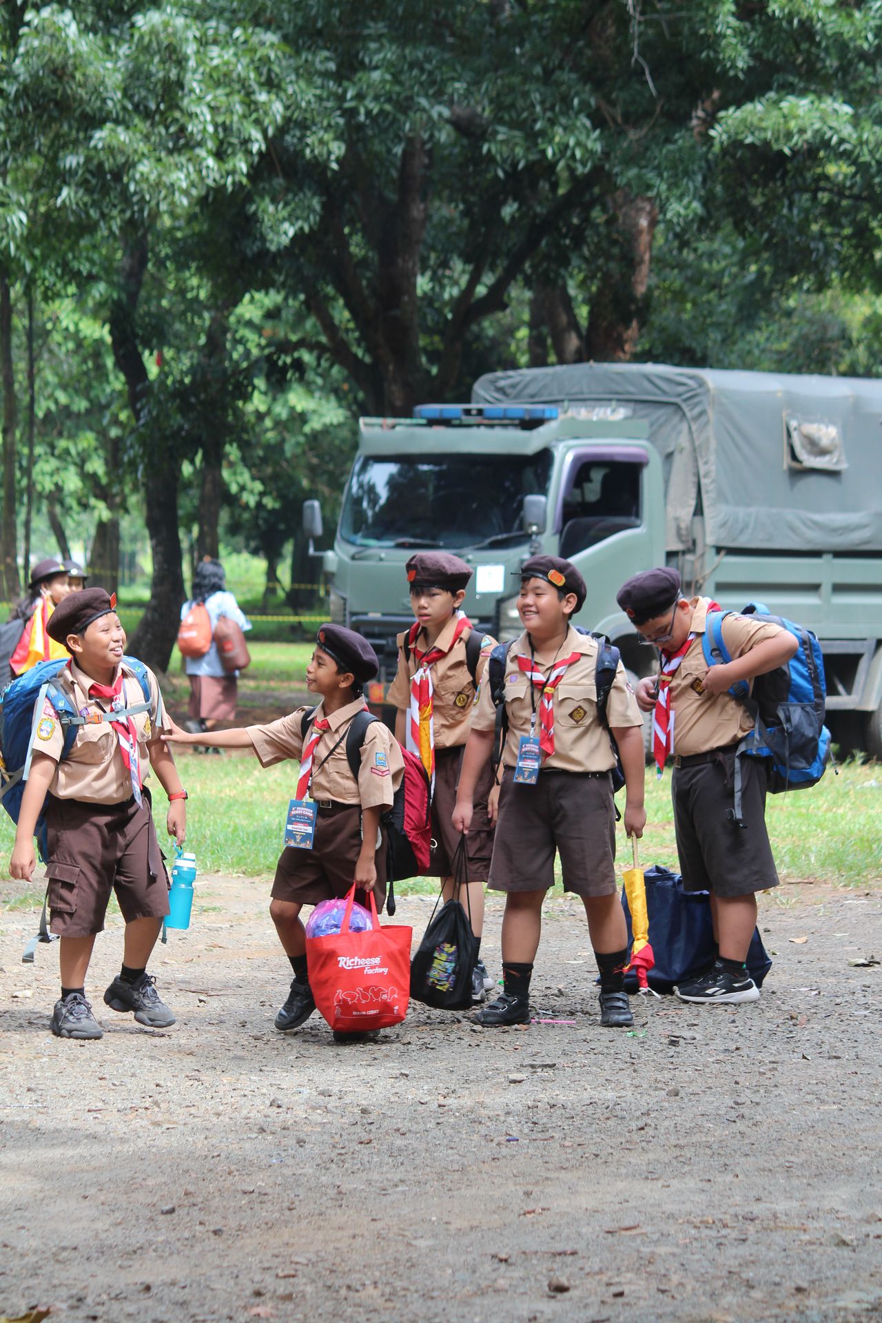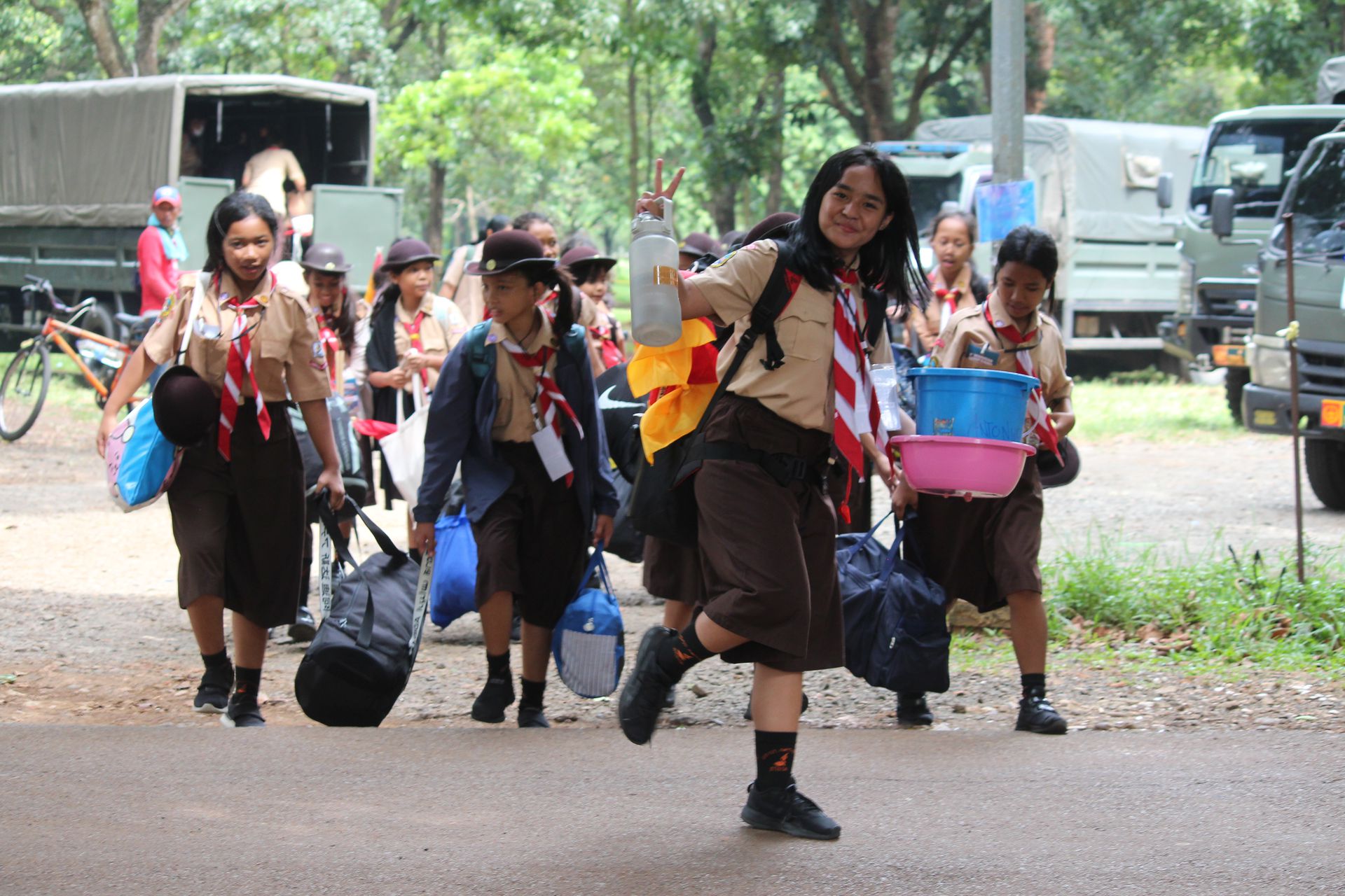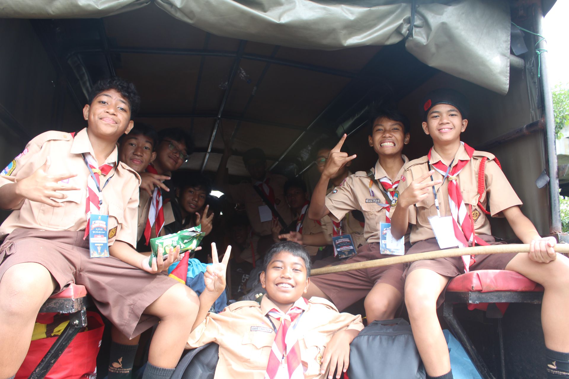 Setelah upacara selesai, para peserta kembali ke area masing-masing untuk mengambil barang. Mereka kemudian memasukkan perlengkapan ke dalam tronton sesuai arahan panitia. Proses keberangkatan diatur berdasarkan pembagian kendaraan sehingga seluruh peserta dapat berangkat dengan tertib menuju Buperta.